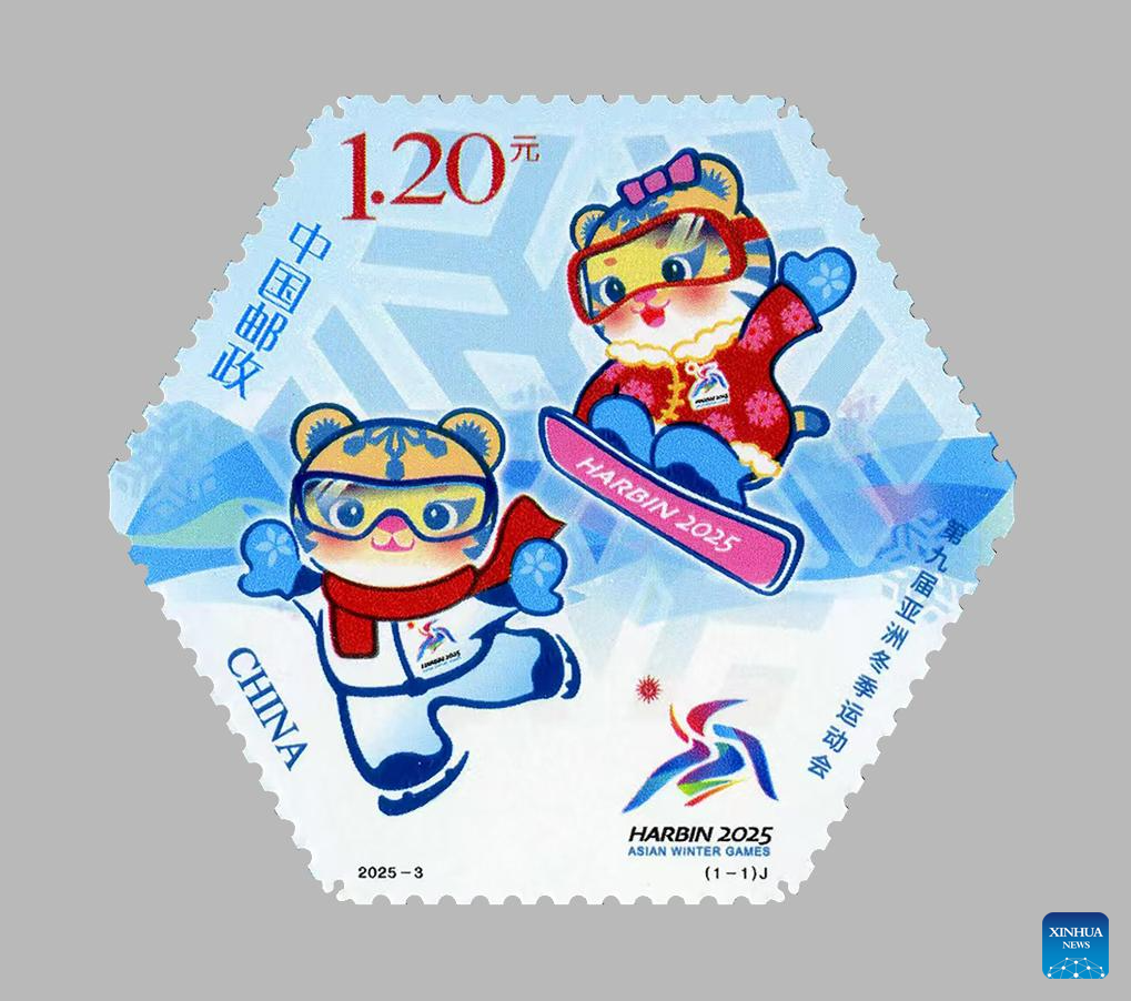 The image showcases the commemorative stamp issued by China Post on Feb. 7, 2025 for the 9th Asian Winter Games. The stamp set consists of a single stamp with a face value of 1.2 yuan (about 0.16 U.S. dollars). (Xinhua)