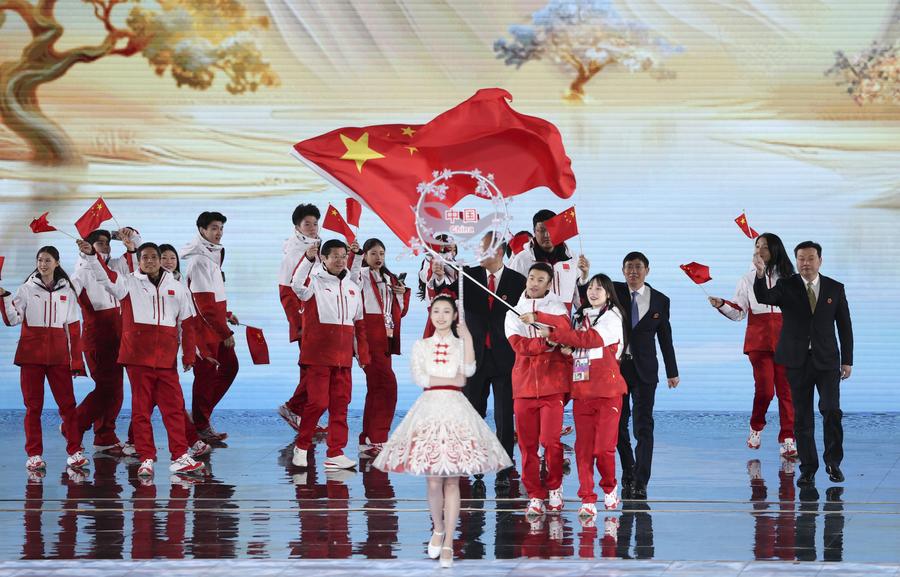 The Chinese delegation parades during the opening ceremony, Feb. 7, 2025. (Xinhua/Yang Lei)