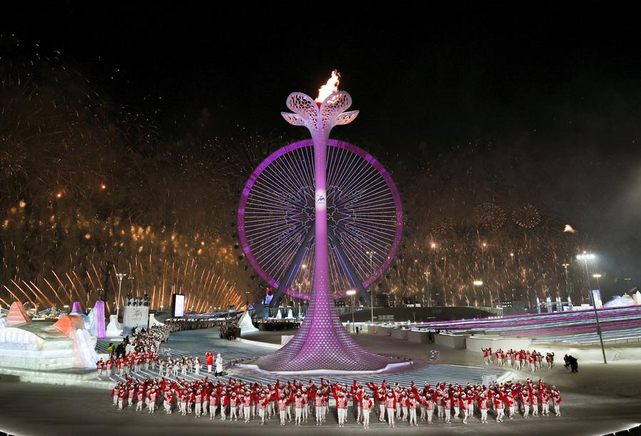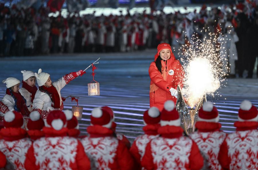 The opening ceremony reached its climax when four torchbearers - two-time Olympic champion and short track speed skater Yang Yang, China's first male Winter Olympic gold medalist and freestyle skier Han Xiaopeng, Olympic race walk champion Wang Zhen, and Sochi Winter Olympics speed skating champion Zhang Hong - joined by children holding ice lanterns, lit the lilac-shaped cauldron at the opening ceremony's sub-venue, Harbin Ice and Snow World, the world's largest ice and snow theme park.