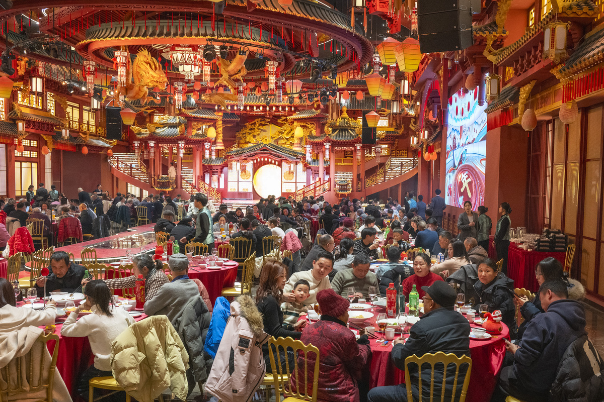 Local residents in Wuhu, Anhui province, enjoy their New Year's eve dinner in a restaurant on Jan 28. (Photo/Xinhua)