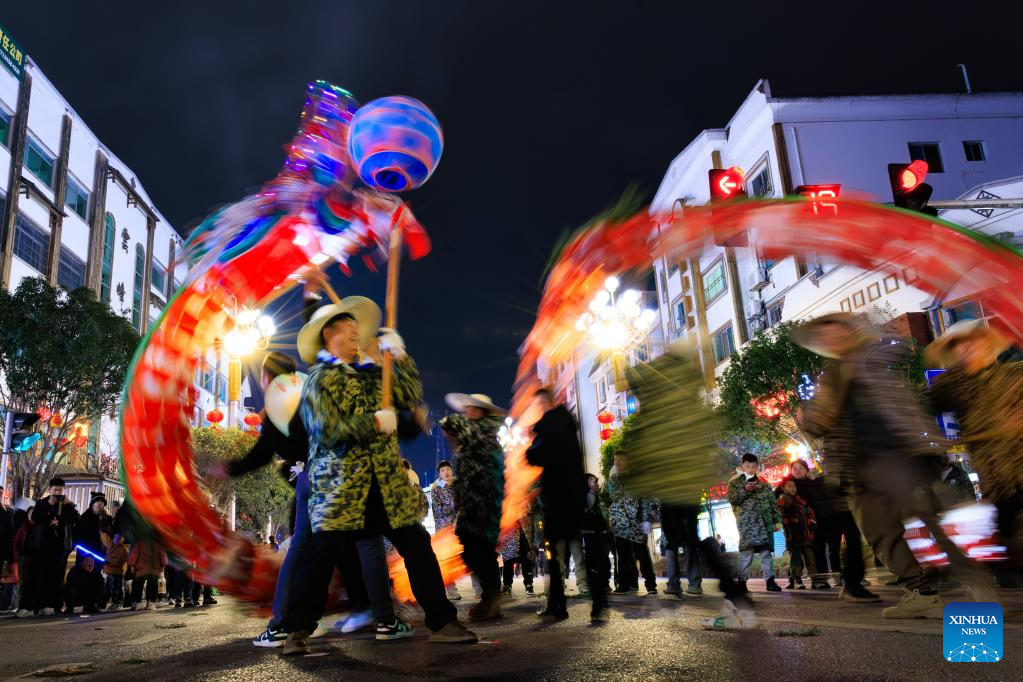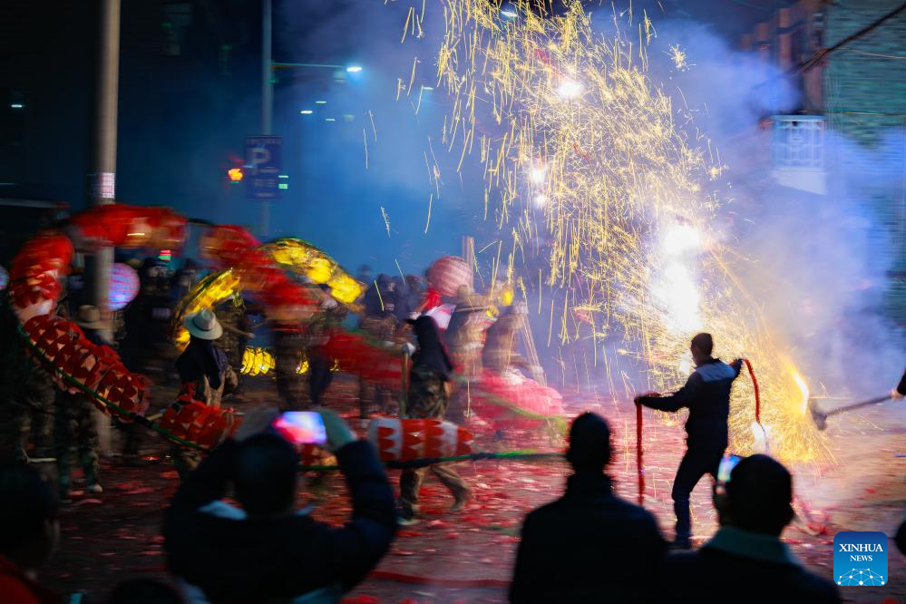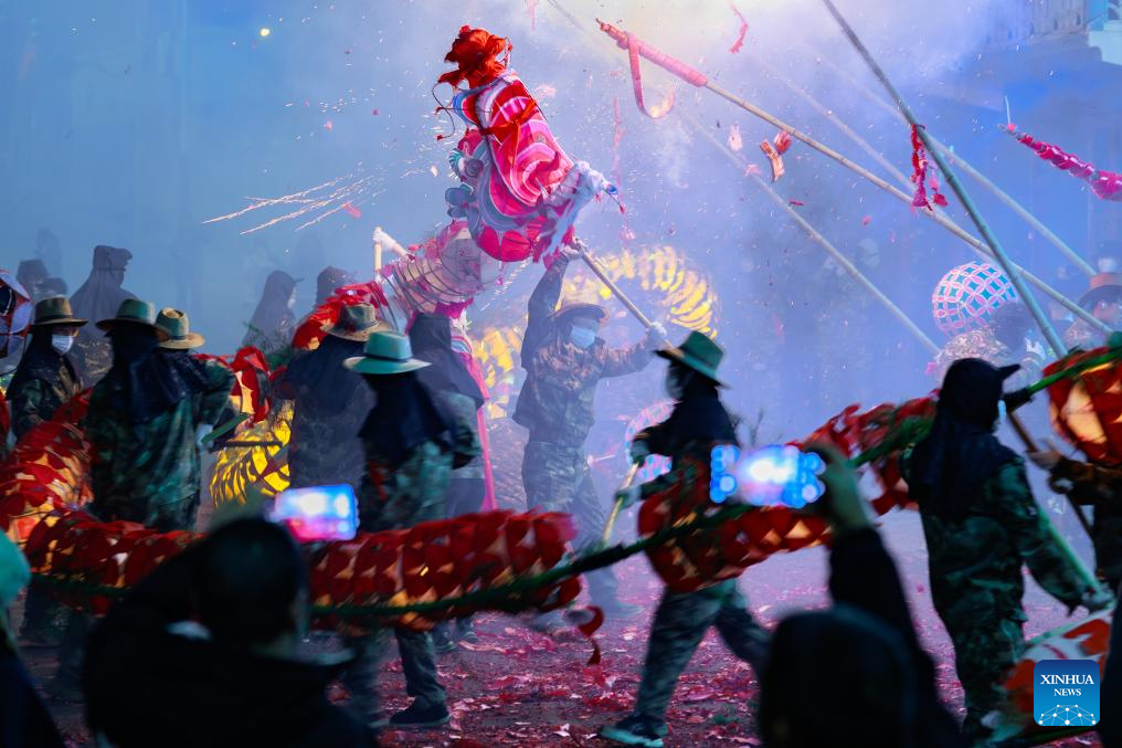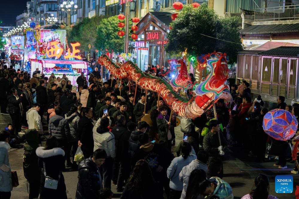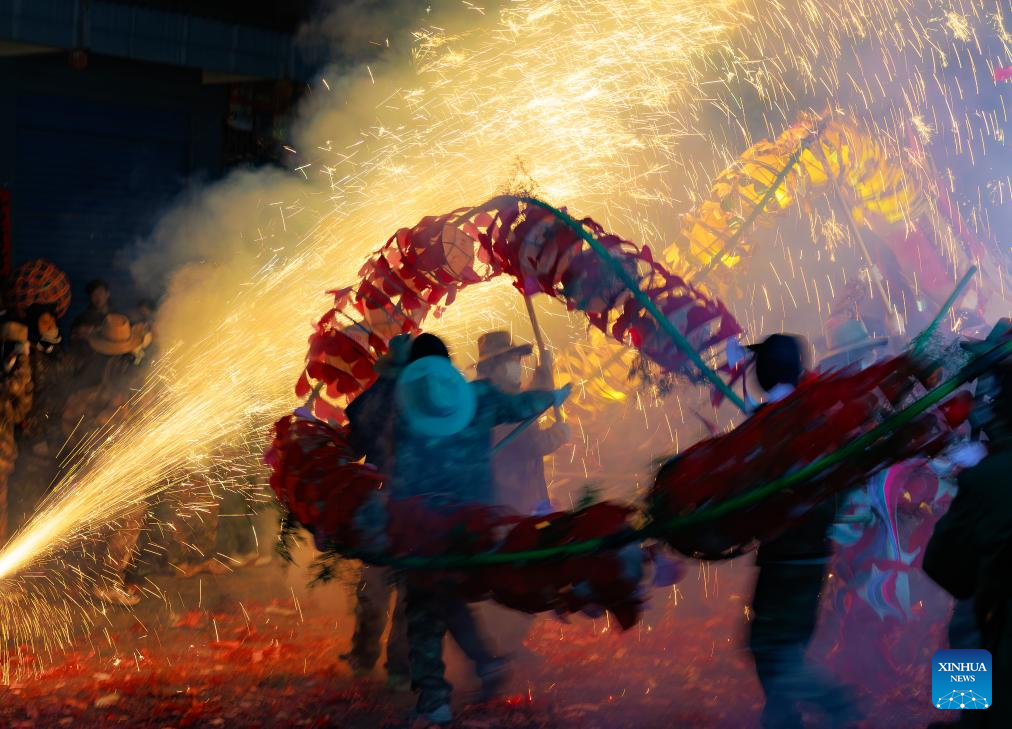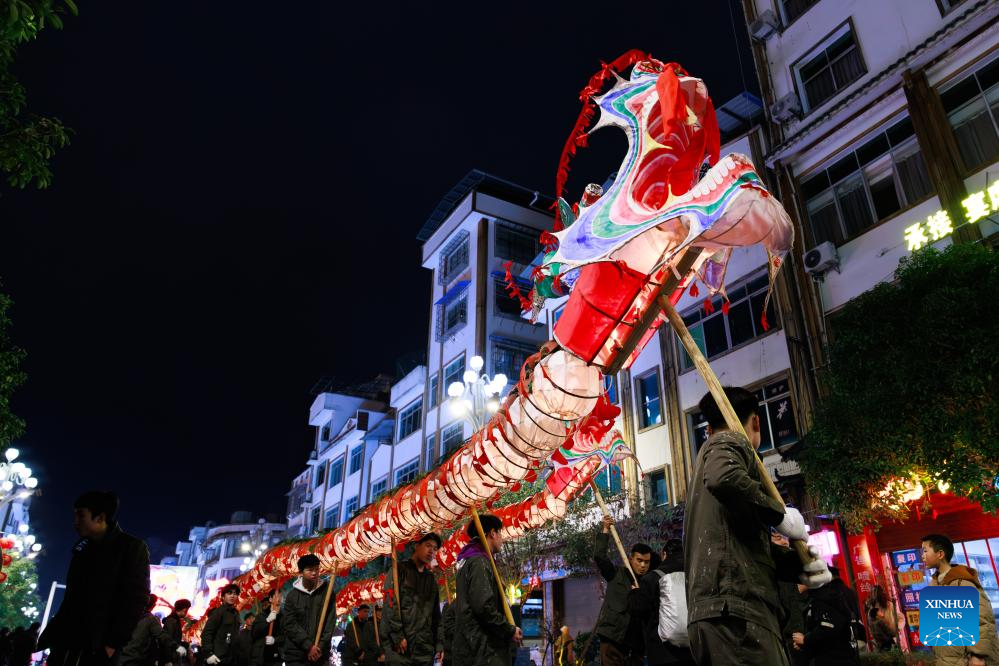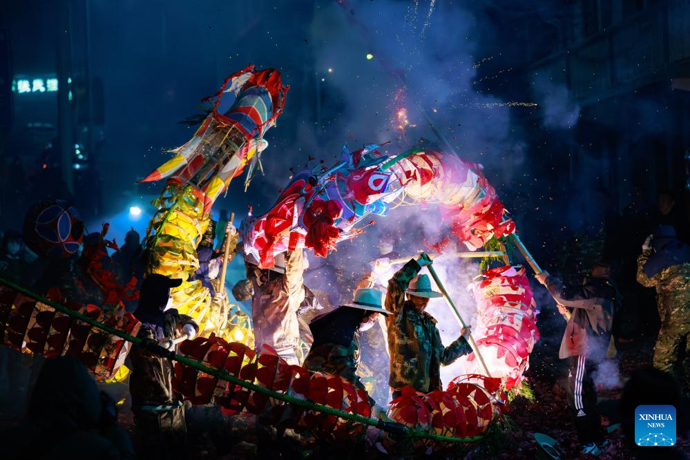 Dragon dancers perform in Shibing County of Qiandongnan Miao and Dong Autonomous Prefecture, southwest China's Guizhou Province, Feb. 6, 2025. "Shibing dragon lantern", a provincial intangible cultural heritage in Guizhou, is a festive dragon lantern dance in Shibing County and featured by the fantastic performance amid fireworks. In recent years, the dragon lantern parade has become a cultural icon of Shibing, attracting numerous tourists during holidays. (Xinhua/Liu Xu)