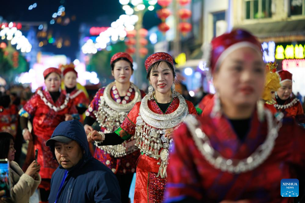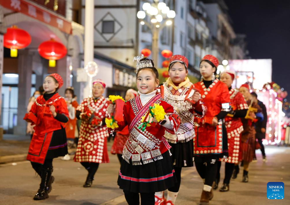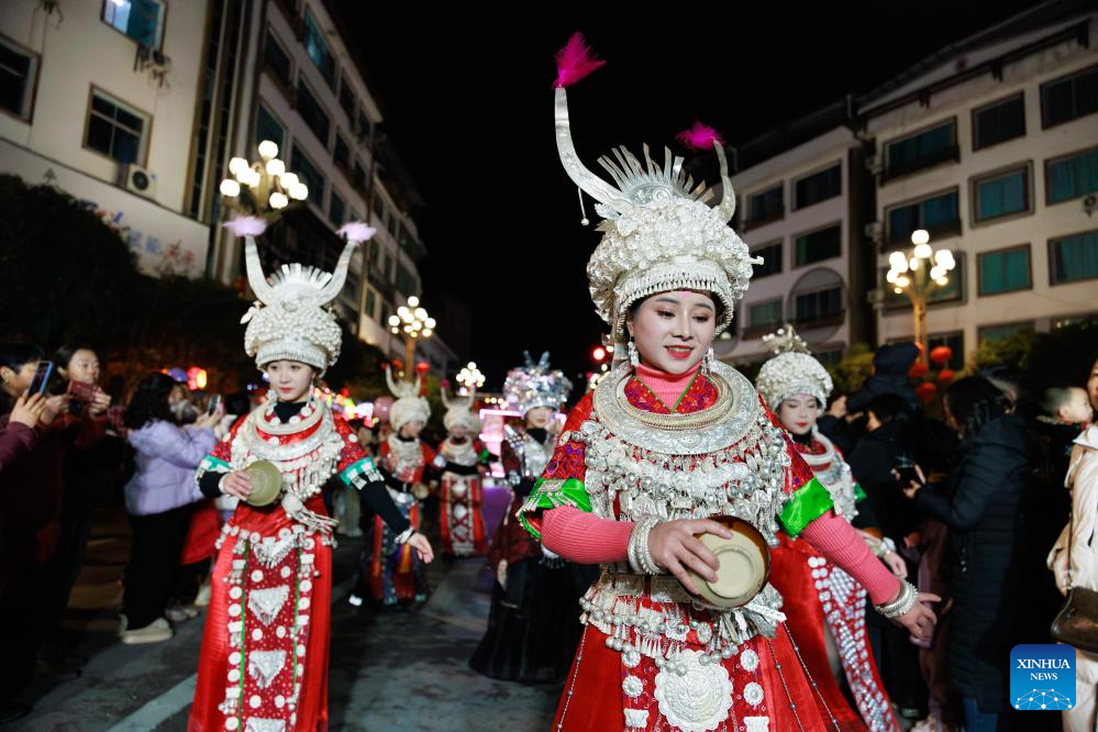 People in ethnic costume parade in Shibing County of Qiandongnan Miao and Dong Autonomous Prefecture, southwest China's Guizhou Province, Feb. 6, 2025. "Shibing dragon lantern", a provincial intangible cultural heritage in Guizhou, is a festive dragon lantern dance in Shibing County and featured by the fantastic performance amid fireworks. In recent years, the dragon lantern parade has become a cultural icon of Shibing, attracting numerous tourists during holidays. (Xinhua/Liu Xu)