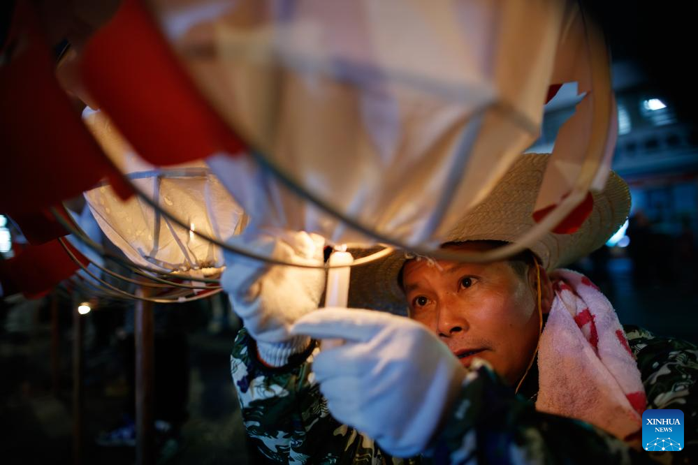 A dragon dancer lights a candle inside a dragon lantern in Shibing County of Qiandongnan Miao and Dong Autonomous Prefecture, southwest China's Guizhou Province, Feb. 6, 2025. "Shibing dragon lantern", a provincial intangible cultural heritage in Guizhou, is a festive dragon lantern dance in Shibing County and featured by the fantastic performance amid fireworks. In recent years, the dragon lantern parade has become a cultural icon of Shibing, attracting numerous tourists during holidays. (Xinhua/Liu Xu)