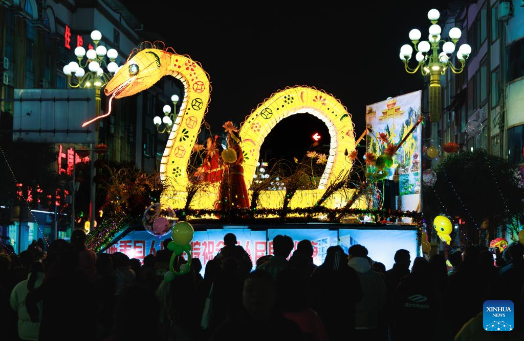 A float is seen during a parade in Shibing County of Qiandongnan Miao and Dong Autonomous Prefecture, southwest China's Guizhou Province, Feb. 6, 2025. "Shibing dragon lantern", a provincial intangible cultural heritage in Guizhou, is a festive dragon lantern dance in Shibing County and featured by the fantastic performance amid fireworks. In recent years, the dragon lantern parade has become a cultural icon of Shibing, attracting numerous tourists during holidays. (Xinhua/Liu Xu)