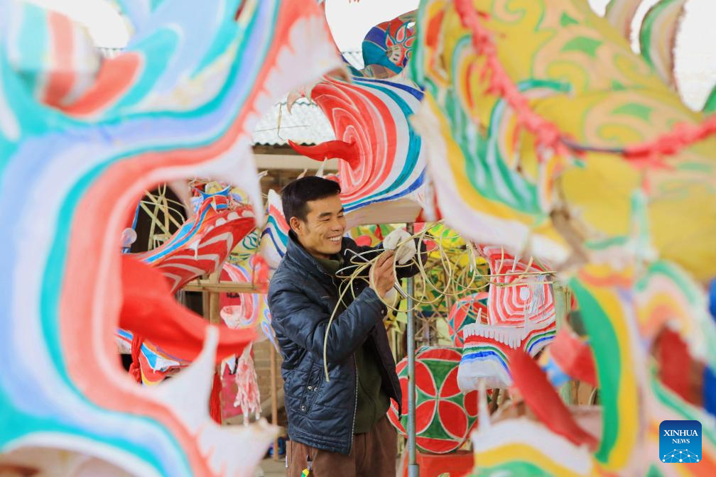 A folk artisan makes a dragon lantern in Shibing County of Qiandongnan Miao and Dong Autonomous Prefecture, southwest China's Guizhou Province, Jan. 16, 2025. "Shibing dragon lantern", a provincial intangible cultural heritage in Guizhou, is a festive dragon lantern dance in Shibing County and featured by the fantastic performance amid fireworks. In recent years, the dragon lantern parade has become a cultural icon of Shibing, attracting numerous tourists during holidays. (Photo by Tai Shengzhi/Xinhua)