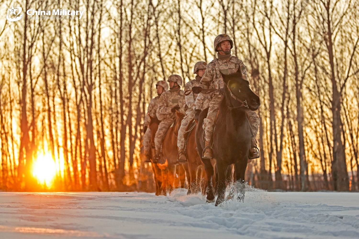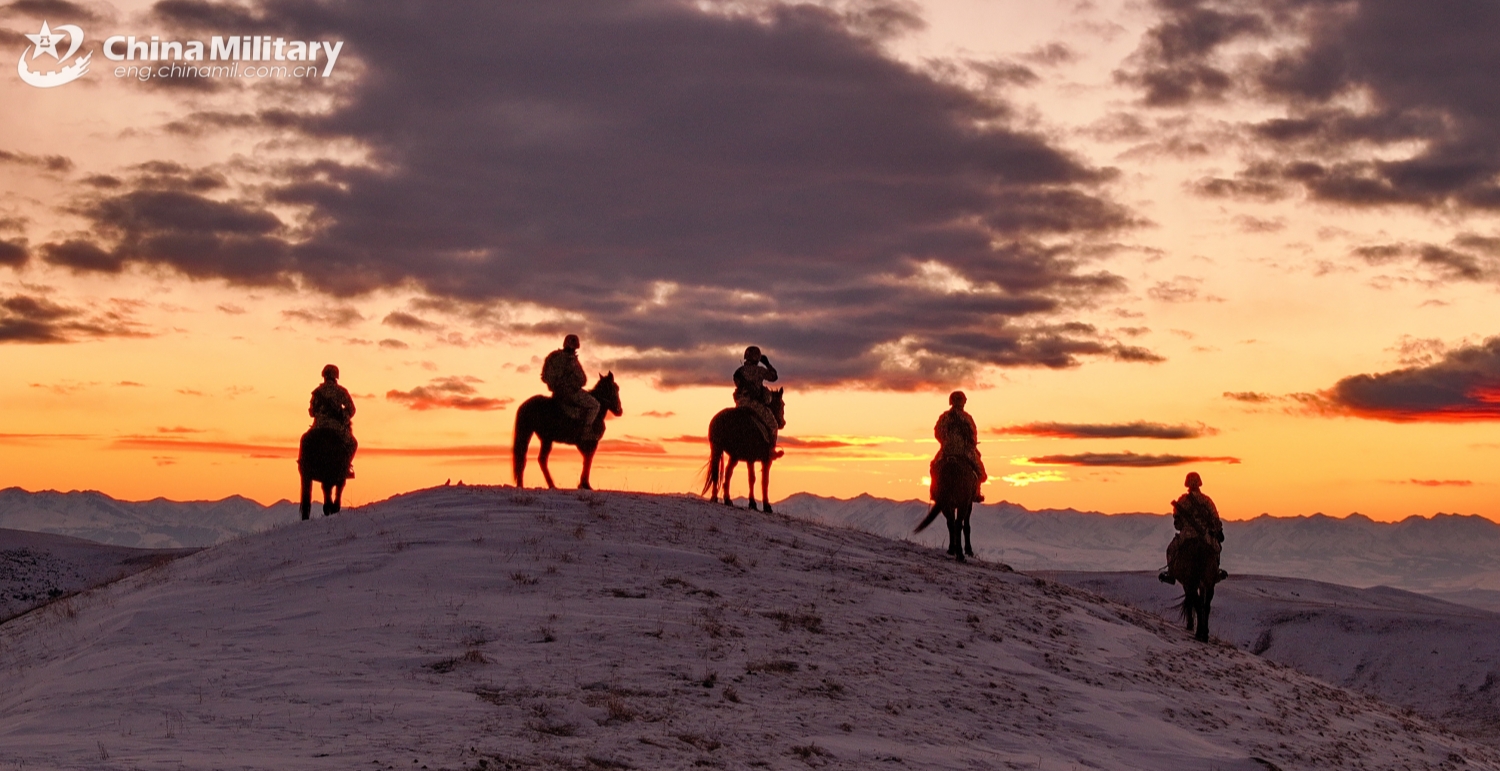 Soldiers assigned to the Songbai border defense company under the Chinese PLA Xinjiang Military Command patrol the snow-covered border on horseback at the northern foot of Tianshan Mountains on January 23, 2025. (eng.chinamil.com.cn/Photo by Ma Wenqing)