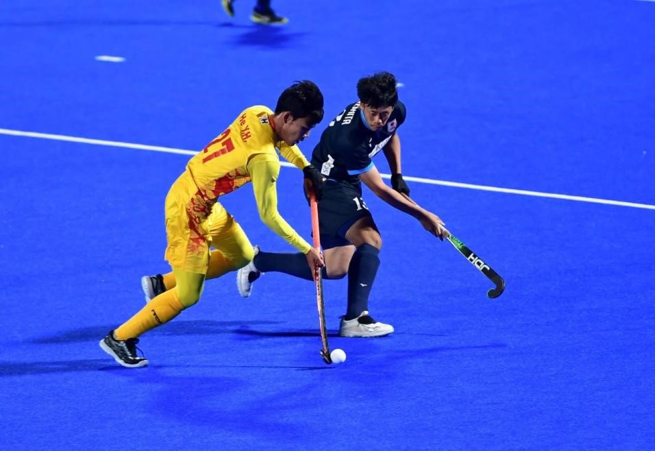 A Chinese field hockey player (left) competes at the Hero Asian Champions Trophy 2024, Morin Dawa Daur autonomous banner, north China's Inner Mongolia autonomous region. (People's Daily/Wu Yong)