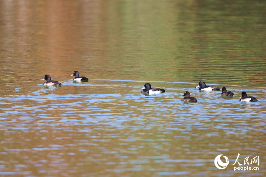A photo captures a group of ducks as they paddle across a pond. (People's Daily Online/Chen Bo)