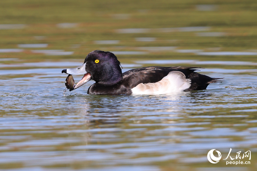 A photo shows a tufted duck foraging for food. (People's Daily Online/Chen Bo)