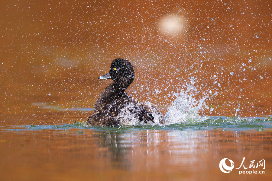 A photo captures a duck as it grooms its feathers and splashes water. (People's Daily Online/Chen Bo)