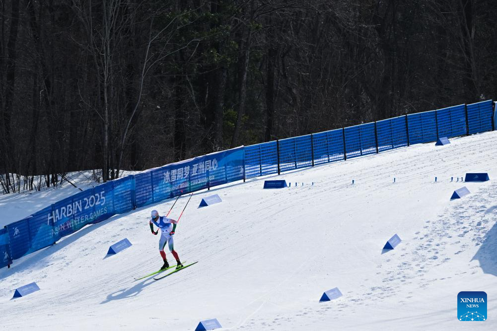 A skier competes during the men's sprint classic qualification match of the cross-country skiing event at the 9th Asian Winter Games in Yabuli, northeast China's Heilongjiang Province, Feb. 8, 2025. (Xinhua/Zhang Long)