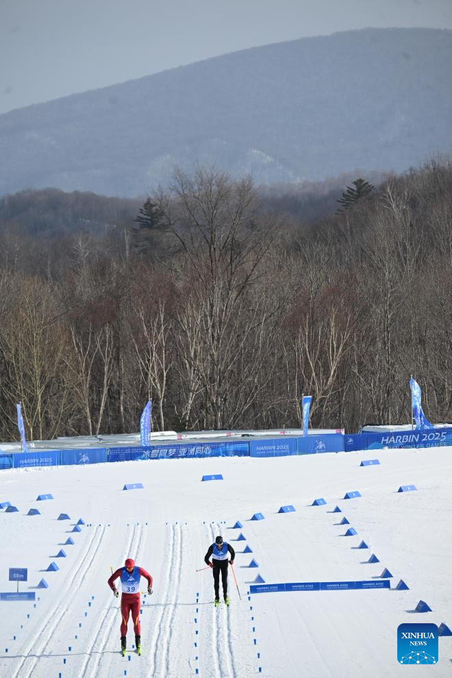 Skiers compete during the men's sprint classic qualification match of the cross-country skiing event at the 9th Asian Winter Games in Yabuli, northeast China's Heilongjiang Province, Feb. 8, 2025. (Xinhua/Zhang Long)