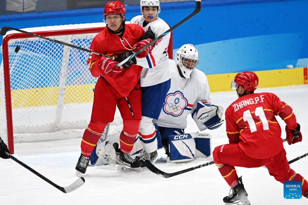Zhang Pengfei (front) of China competes during the men's ice hockey group A match between China and Chinese Taipei at 2025 Asian Winter Games in Harbin, northeast China's Heilongjiang Province, on Feb. 8, 2025. (Xinhua/Li Ziheng)