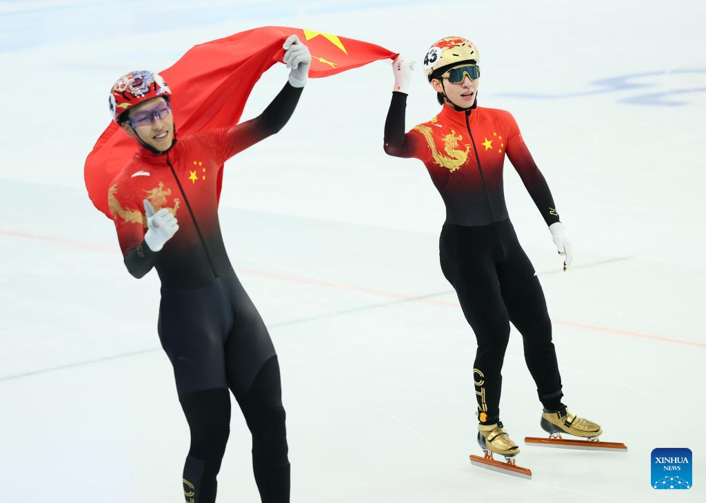 Lin Xiaojun (R) and Sun Long of China celebrate after the men's 500m final of the short track speed skating event at the 9th Asian Winter Games in Harbin, northeast China's Heilongjiang Province, Feb. 8, 2025. (Photo by Lan Hongguang/Xinhua)