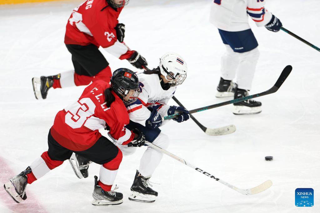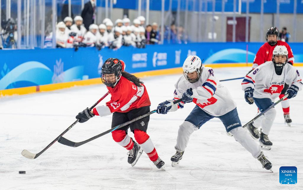 Wong Charleen (1st L) of China's Hong Kong vies with Apichaya Kosanunt (2nd L) of Thailand during the women's ice hockey preliminary round group B match between China's Hong Kong and Thailand at 2025 Asian Winter Games in Harbin, northeast China's Heilongjiang Province, on Feb. 8, 2025. (Xinhua/Sun Fei)