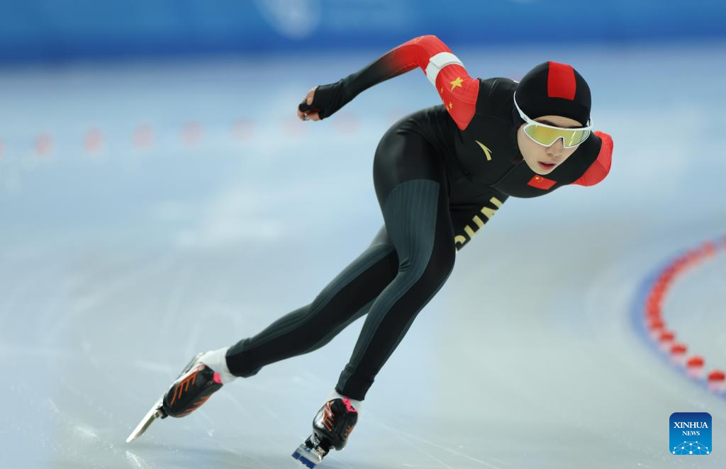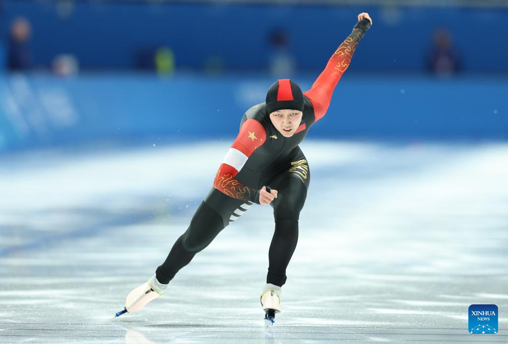 Ahenaer Adake of China competes during the women's 1500m final of the speed skating event at the 9th Asian Winter Games in Harbin, northeast China's Heilongjiang Province, Feb. 8, 2025. (Xinhua/Wang Kaiyan)