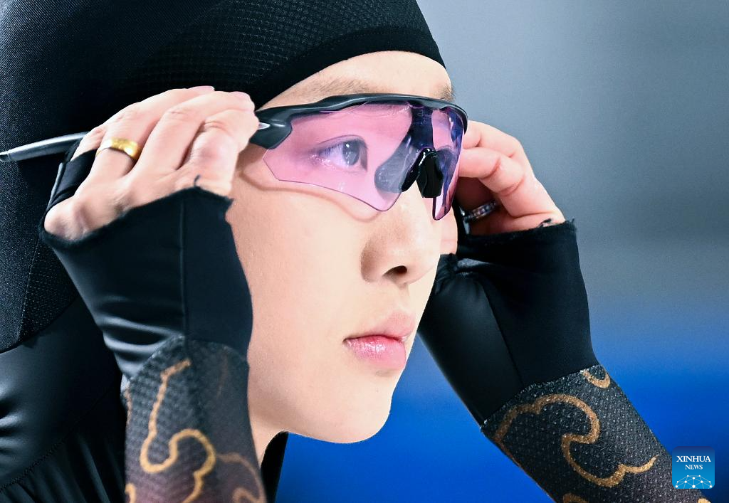 Yang Binyu of China reacts before the women's 1500m final of the speed skating event at the 9th Asian Winter Games in Harbin, northeast China's Heilongjiang Province, Feb. 8, 2025. (Xinhua/Chen Zhenhai)