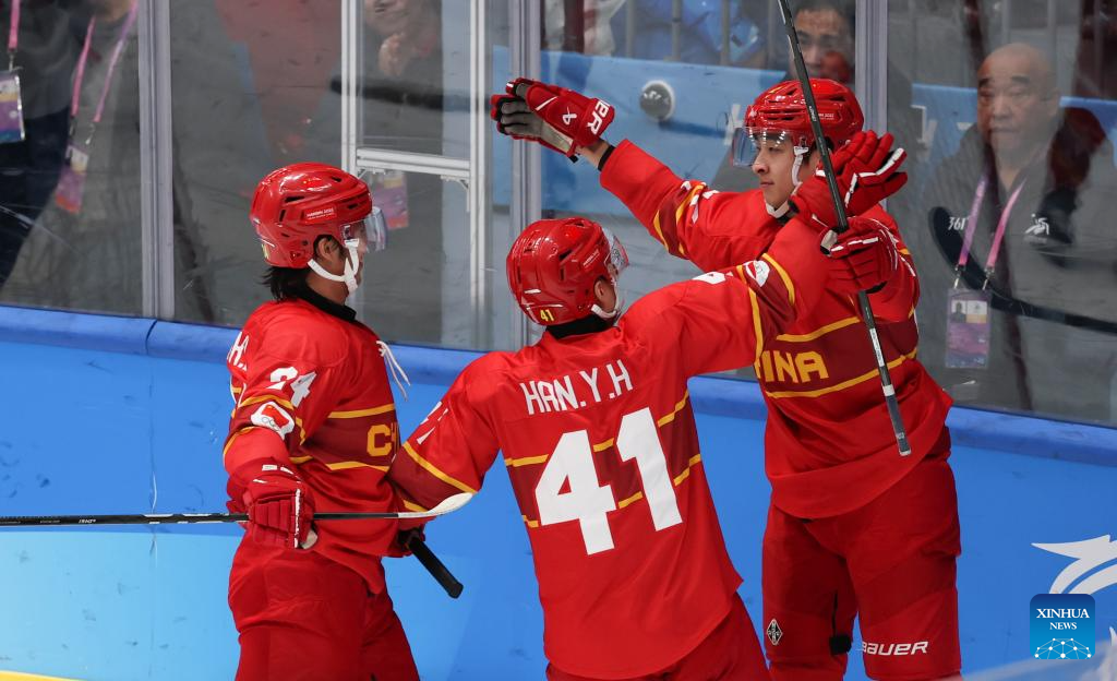 Players of China celebrates scoring during the men's ice hockey group A match between China and Chinese Taipei at 2025 Asian Winter Games in Harbin, northeast China's Heilongjiang Province, on Feb. 8, 2025. (Xinhua/Yang Lei)