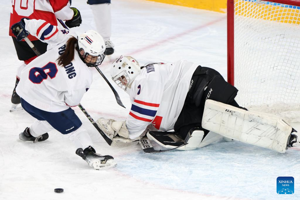 Li Ching Laam (L) of China's Hong Kong competes during the women's ice hockey group B match between China's Hongkong and Thailand at 2025 Asian Winter Games in Harbin, northeast China's Heilongjiang Province, on Feb. 8, 2025. (Xinhua/Chen Bin)