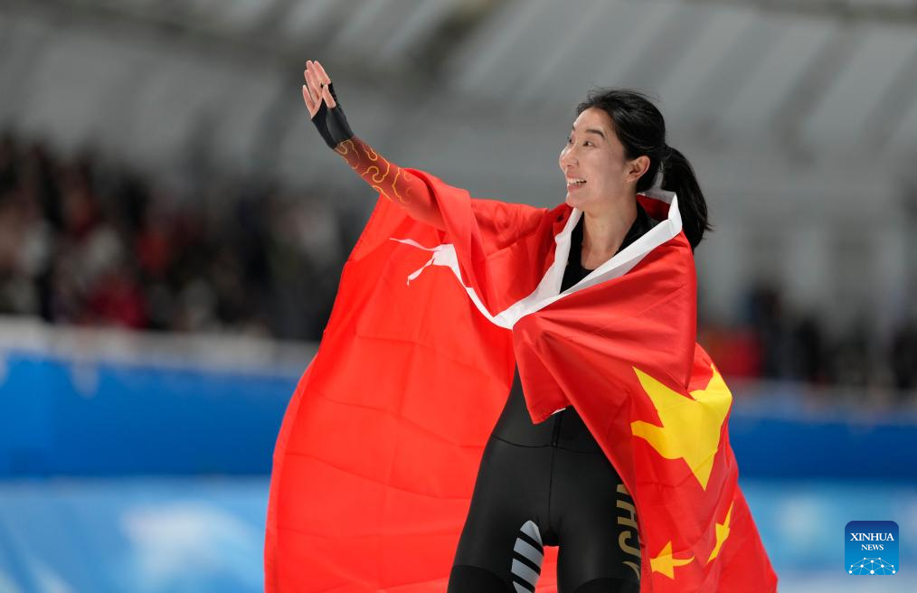 Han Mei of China waves after winning the women's 1500m final of the speed skating event at the 9th Asian Winter Games in Harbin, northeast China's Heilongjiang Province, Feb. 8, 2025. (Xinhua/Wang Jianwei)