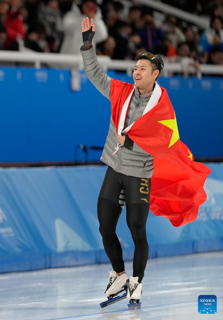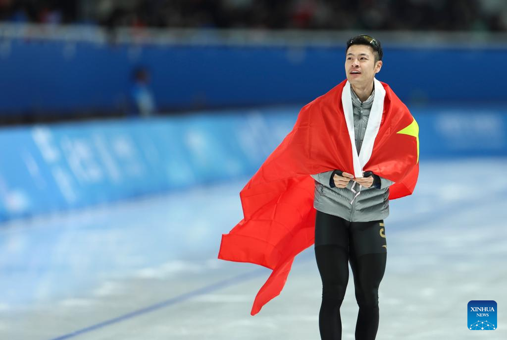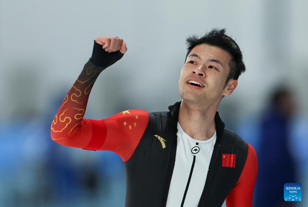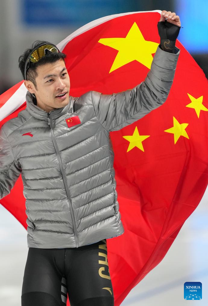 Ning Zhongyan of China celebrates after the men's 1500m final match of the speed skating event at the 9th Asian Winter Games in Harbin, northeast China's Heilongjiang Province, Feb. 8, 2025. (Xinhua/Wang Kaiyan)