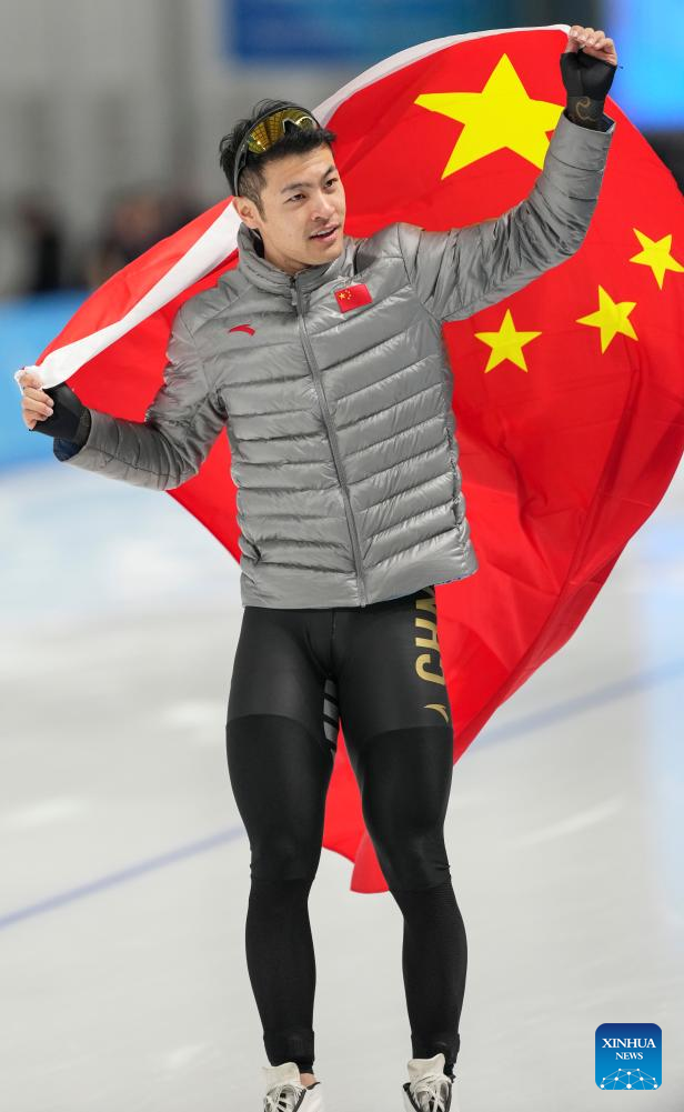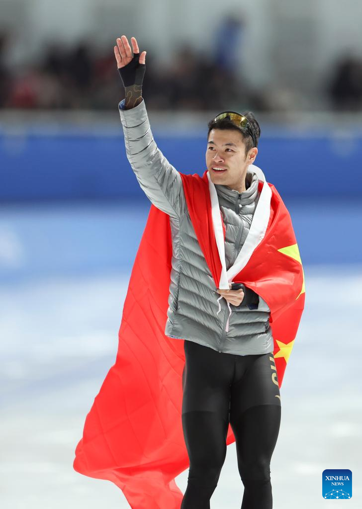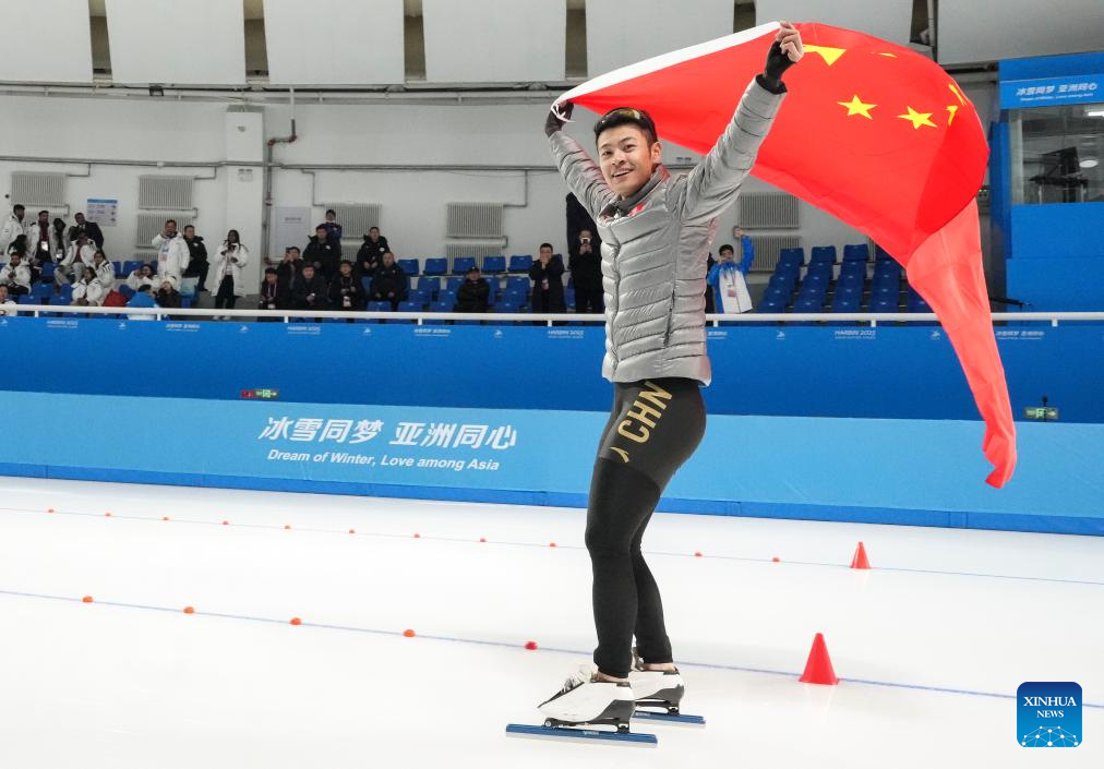 Ning Zhongyan of China celebrates after the men's 1500m final match of the speed skating event at the 9th Asian Winter Games in Harbin, northeast China's Heilongjiang Province, Feb. 8, 2025. (Xinhua/Li Yibo)