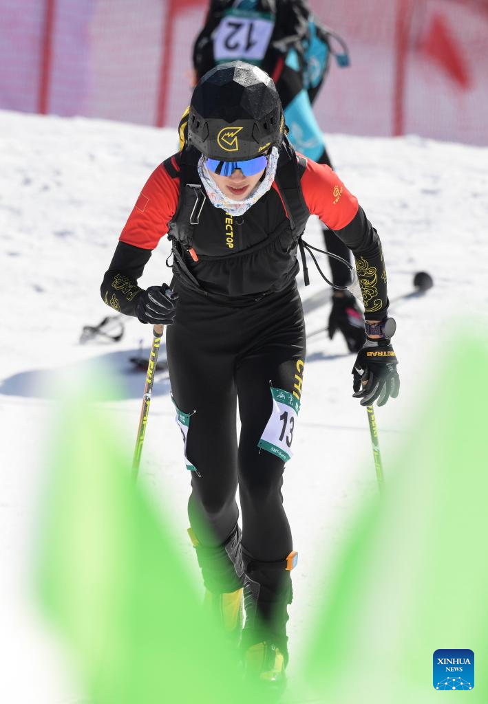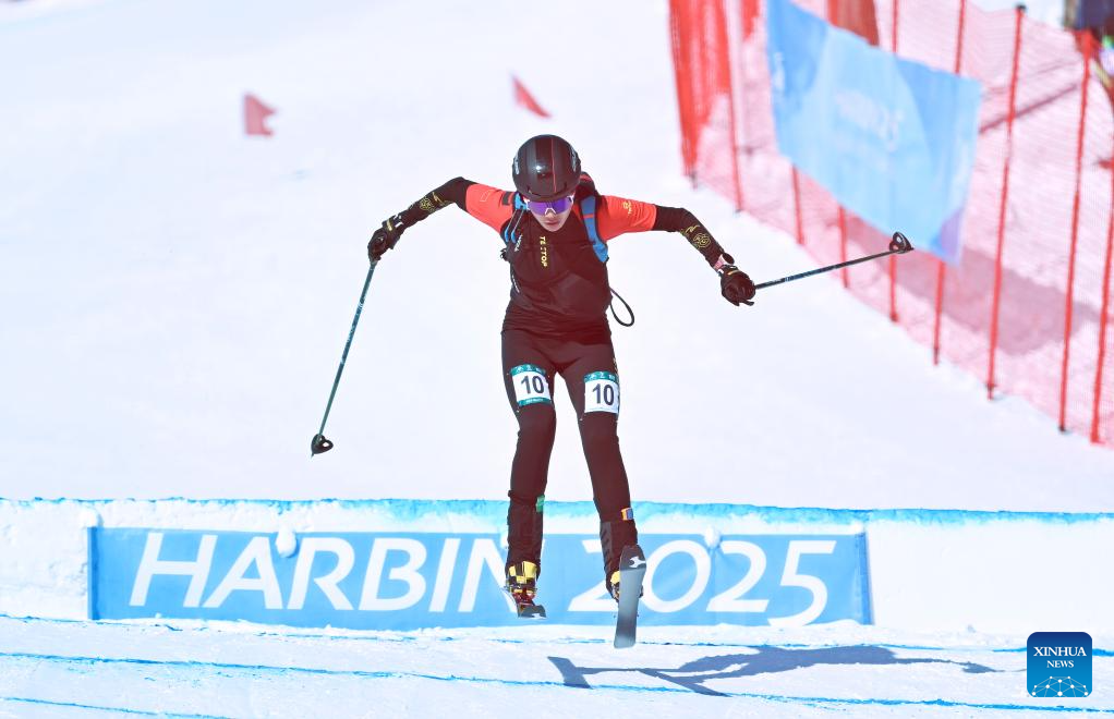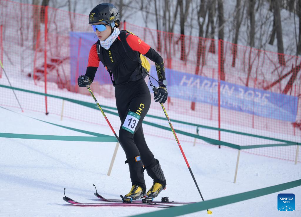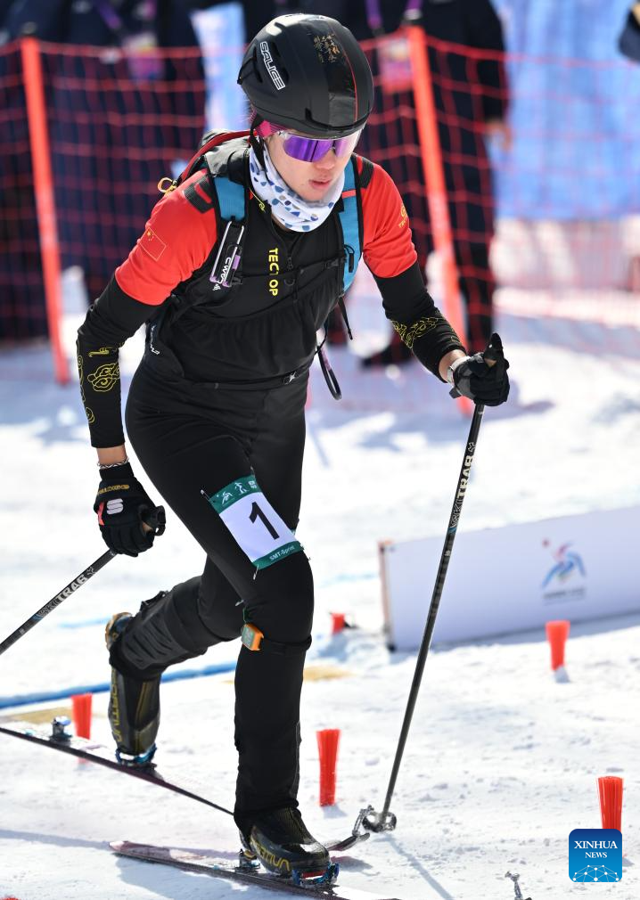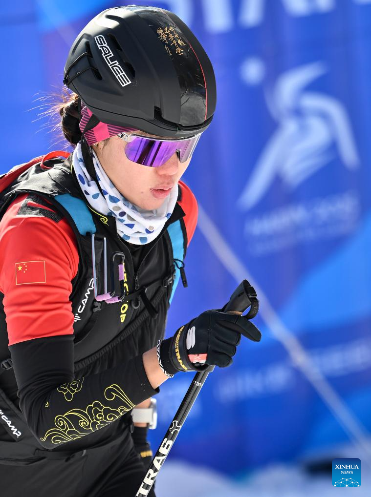 Ji Lulu of China competes during the Ski Mountaineering women's sprint qaulification match at the 9th Asian Winter Games in Yabuli, northeast China's Heilongjiang Province, Feb. 9, 2025. (Xinhua/Mu Yu)