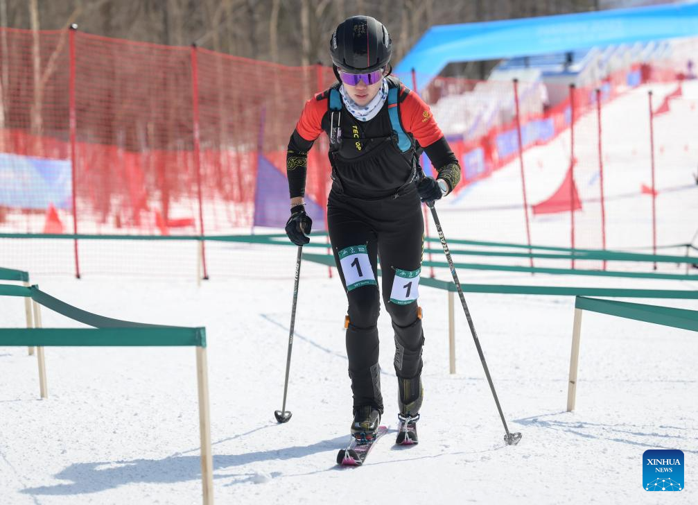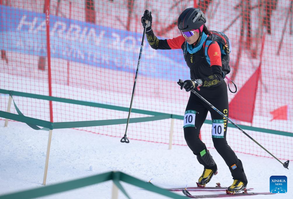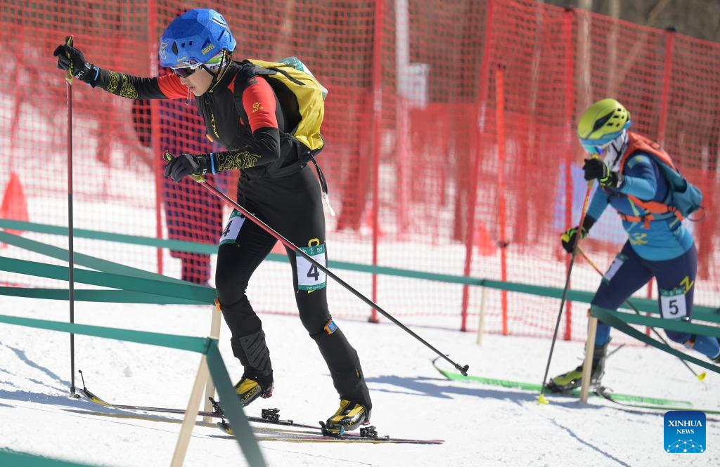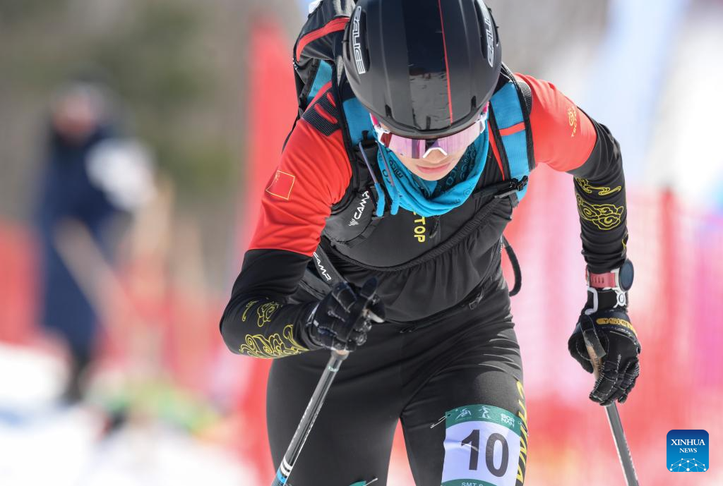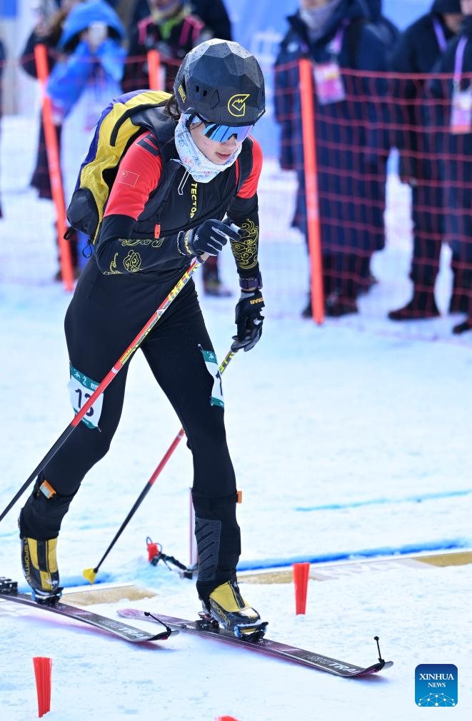 Ji Lulu of China competes during the Ski Mountaineering women's sprint qaulification match at the 9th Asian Winter Games in Yabuli, northeast China's Heilongjiang Province, Feb. 9, 2025. (Xinhua/Mu Yu)