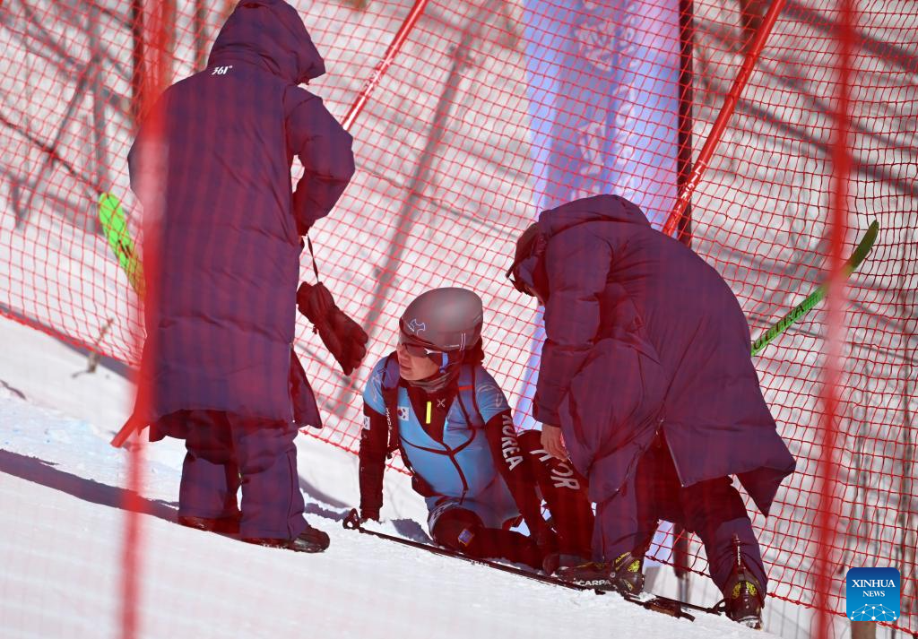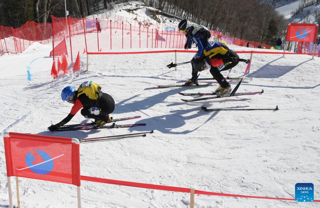 Kim Hana (C) of South Korea hurts during the Ski Mountaineering women's sprint semifinal match at the 9th Asian Winter Games in Yabuli, northeast China's Heilongjiang Province, Feb. 9, 2025. (Xinhua/Mu Yu)