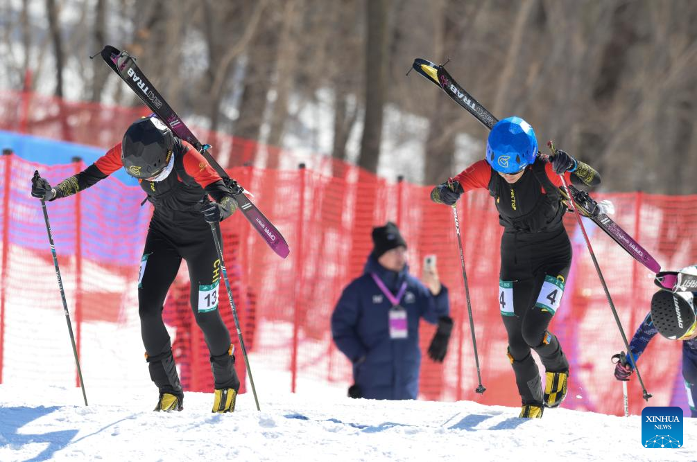 Yu Jingxuan (R) and Cidan Yuzhen (L) of China compete during the Ski Mountaineering women's sprint semifinal match at the 9th Asian Winter Games in Yabuli, northeast China's Heilongjiang Province, Feb. 9, 2025. (Xinhua/Yang Guanyu)