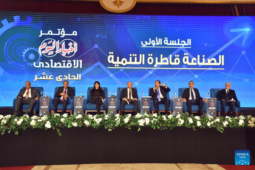 Deputy Speaker of the Egyptian Parliament Mohamed Abou El-Enein (3rd R) speaks at the 11th Akhbar El Youm economic conference in Cairo, Egypt, Feb. 8, 2025. (Xinhua/Ahmed Gomaa)