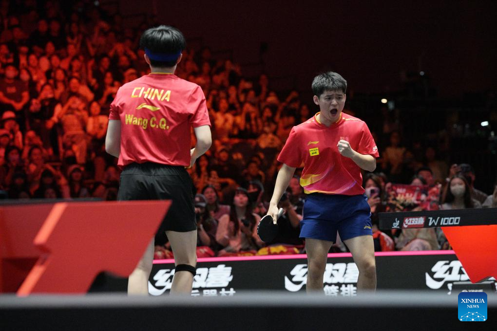 Wang Chuqin (L)/Lin Shidong of China celebrate during the men's doubles final match between Wang Chuqin/Lin Shidong of China and Lin Yun-Ju/Kao Cheng-Jui of Chinese Taipei at the World Table Tennis (WTT) Singapore Smash 2025 in Singapore on Feb. 8, 2025. (Photo by Then Chih Wey/Xinhua)