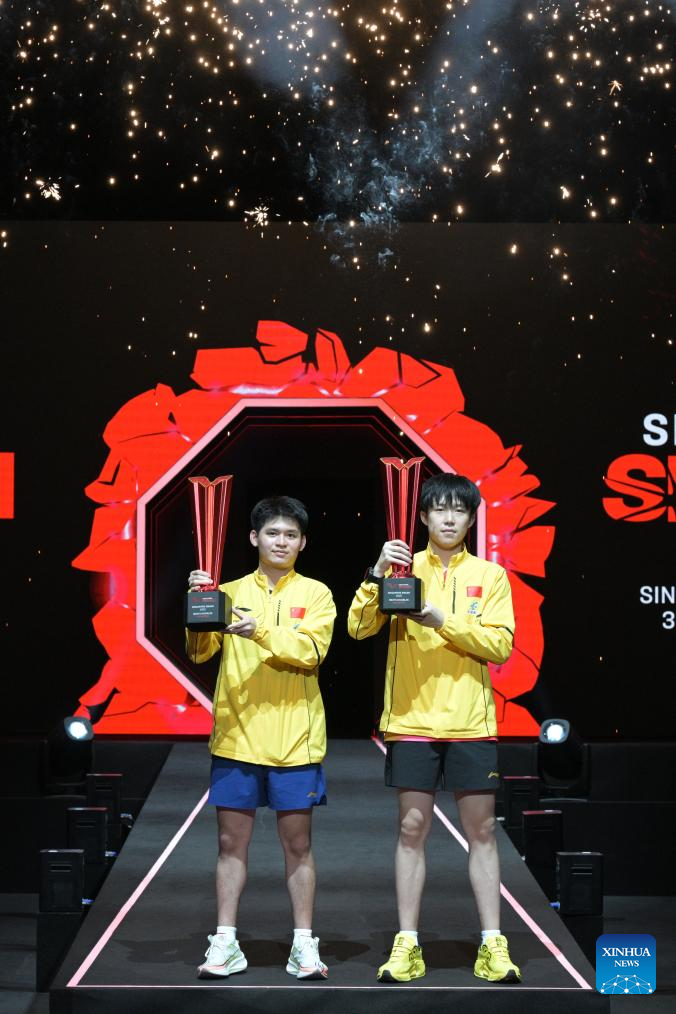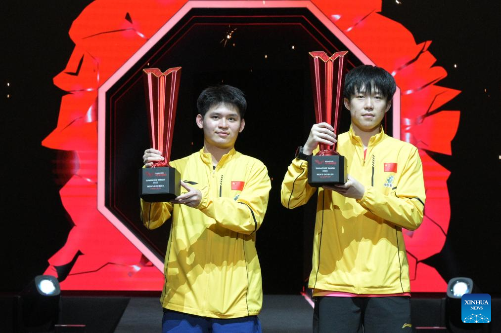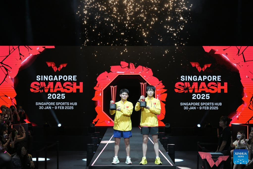 Wang Chuqin (R)/Lin Shidong of China pose on the podium after winning the men's doubles final match between Wang Chuqin/Lin Shidong of China and Lin Yun-Ju/Kao Cheng-Jui of Chinese Taipei at the World Table Tennis (WTT) Singapore Smash 2025 in Singapore on Feb. 8, 2025. (Photo by Then Chih Wey/Xinhua)