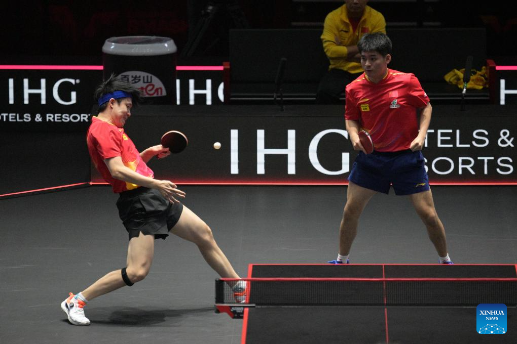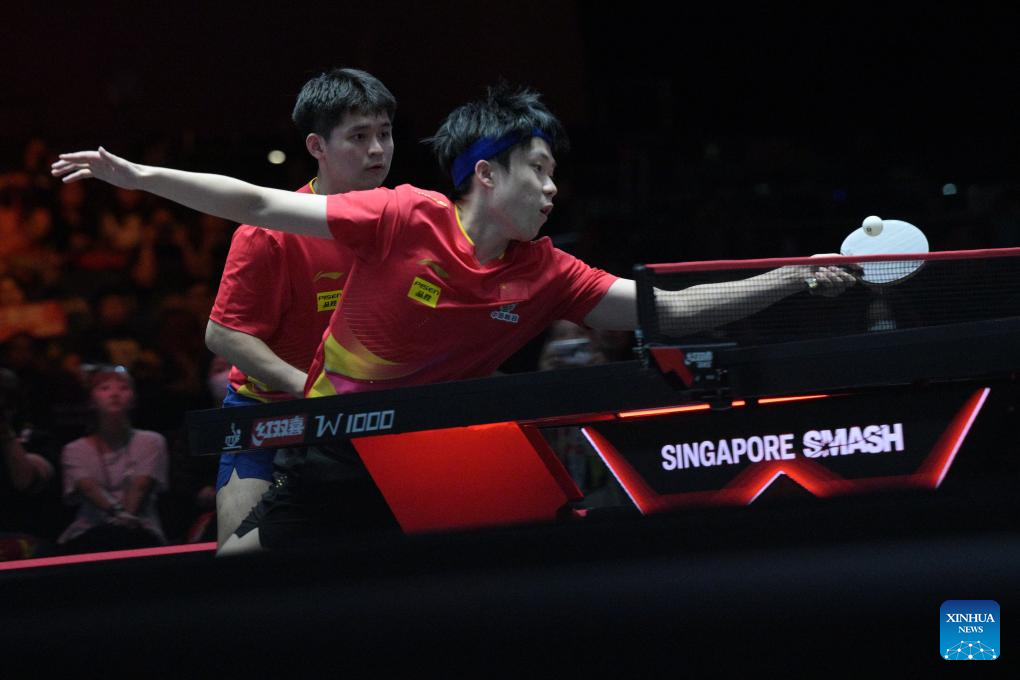 Wang Chuqin (L)/Lin Shidong of China compete during the men's doubles final match between Wang Chuqin/Lin Shidong of China and Lin Yun-Ju/Kao Cheng-Jui of Chinese Taipei at the World Table Tennis (WTT) Singapore Smash 2025 in Singapore on Feb. 8, 2025. (Photo by Then Chih Wey/Xinhua)