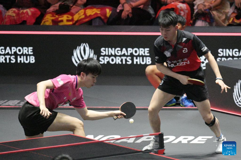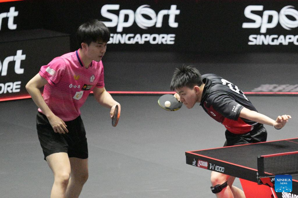 Lin Yun-Ju/Kao Cheng-Jui (R) of Chinese Taipei compete during the men's doubles final match between Wang Chuqin/Lin Shidong of China and Lin Yun-Ju/Kao Cheng-Jui of Chinese Taipei at the World Table Tennis (WTT) Singapore Smash 2025 in Singapore on Feb. 8, 2025. (Photo by Then Chih Wey/Xinhua)