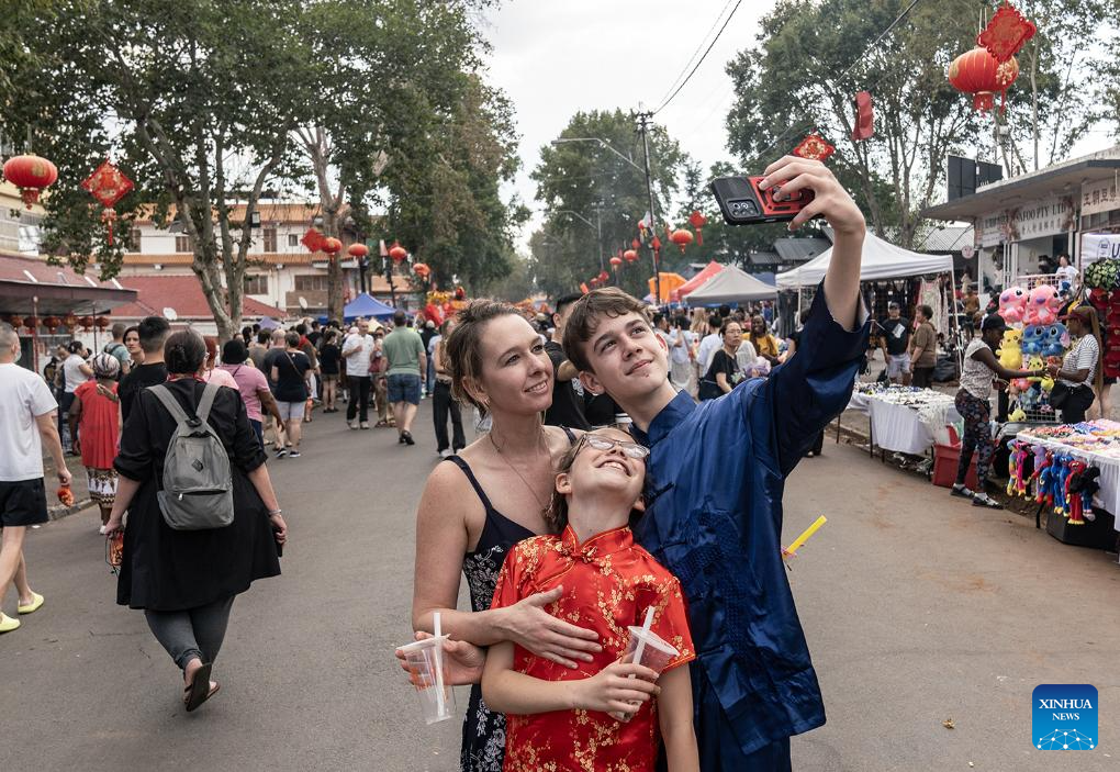 Visitors pose for photos at Johannesburg China Town during a Chinese Lunar New Year celebration in Johannesburg, South Africa, Feb. 8, 2025. (Photo by Shiraaz Mohamed/Xinhua)