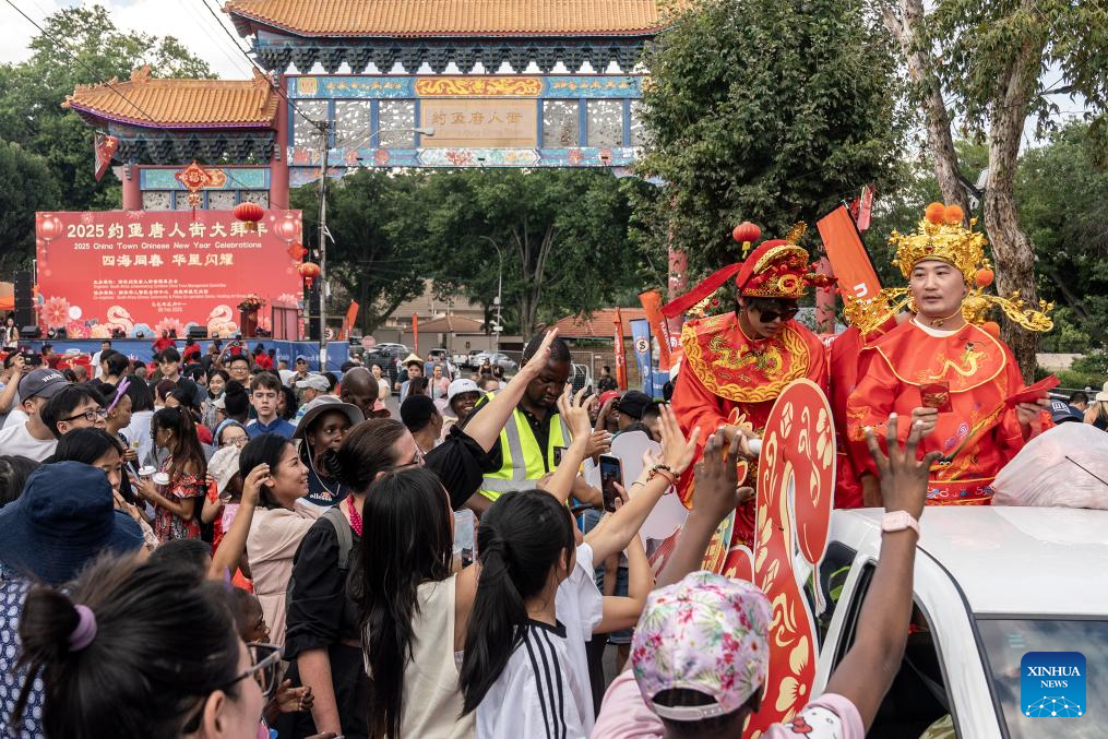 Performers distribute gifts at Johannesburg China Town during a Chinese Lunar New Year celebration in Johannesburg, South Africa, Feb. 8, 2025. (Photo by Shiraaz Mohamed/Xinhua)
