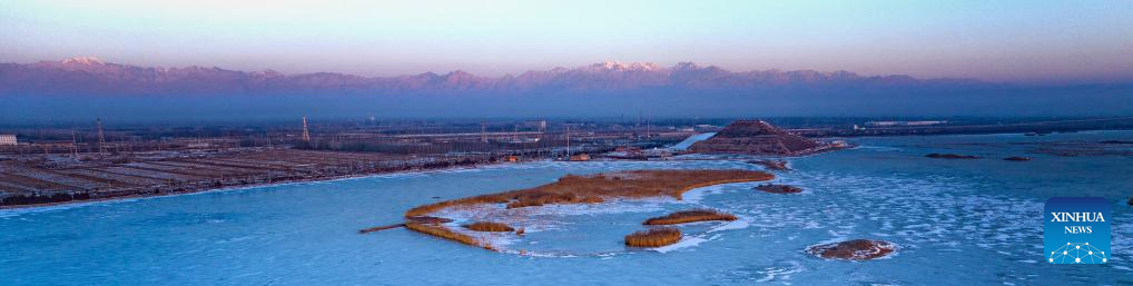 An aerial drone photo taken on Feb. 9, 2025 shows the snow-covered Helan Mountains seen from a wetland park in Yinchuan, northwest China's Ningxia Hui Autonomous Region. (Xinhua/Feng Kaihua)