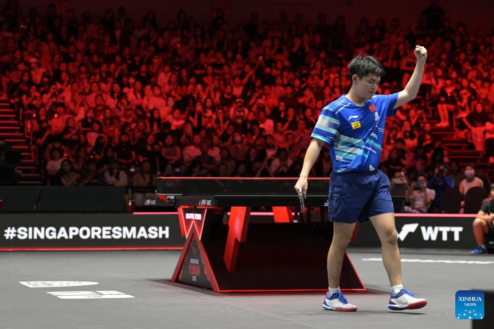 Lin Shidong celebrates winning the men's singles final between Lin Shidong of China and Liang Jingkun of China at the World Table Tennis (WTT) Singapore Smash 2025 in Singapore, Feb. 9, 2025. (Photo by Then Chih Wey/Xinhua)