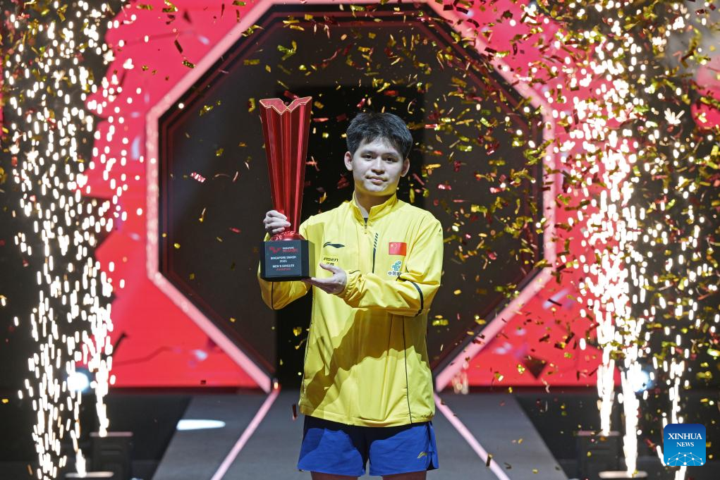 Lin Shidong celebrates during the awarding ceremony after the men's singles final between Lin Shidong of China and Liang Jingkun of China at the World Table Tennis (WTT) Singapore Smash 2025 in Singapore, Feb. 9, 2025. (Photo by Then Chih Wey/Xinhua)