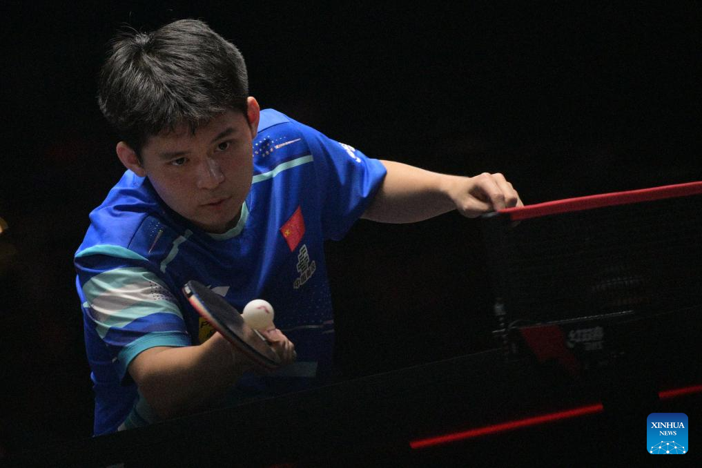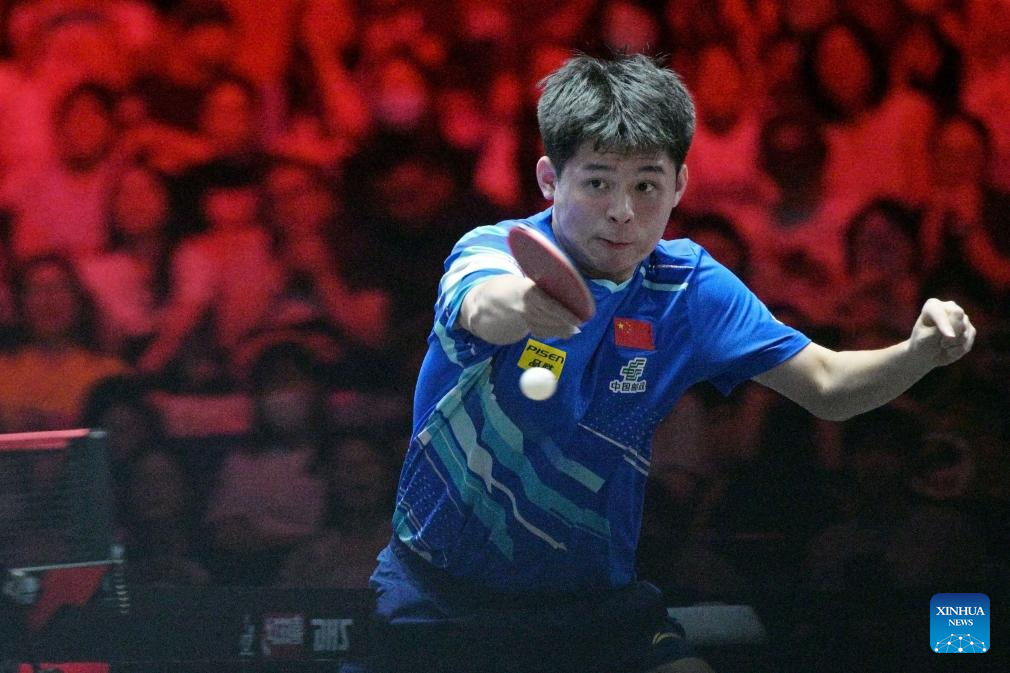 Lin Shidong hits a return during the men's singles final between Lin Shidong of China and Liang Jingkun of China at the World Table Tennis (WTT) Singapore Smash 2025 in Singapore, Feb. 9, 2025. (Photo by Then Chih Wey/Xinhua)