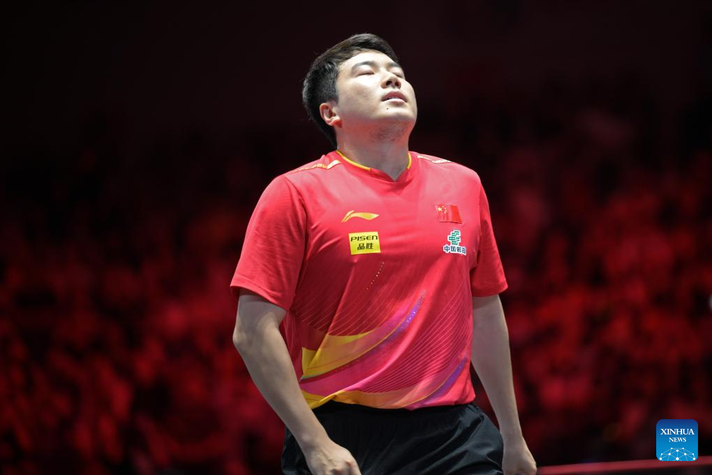 Liang Jingkun reacts during the men's singles final between Lin Shidong of China and Liang Jingkun of China at the World Table Tennis (WTT) Singapore Smash 2025 in Singapore, Feb. 9, 2025. (Photo by Then Chih Wey/Xinhua)
