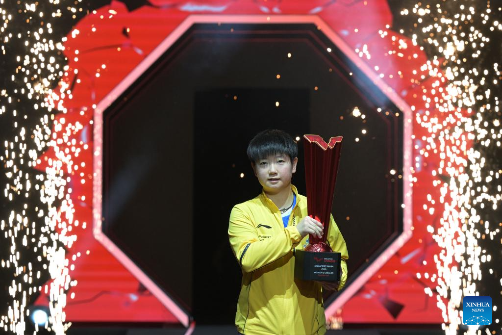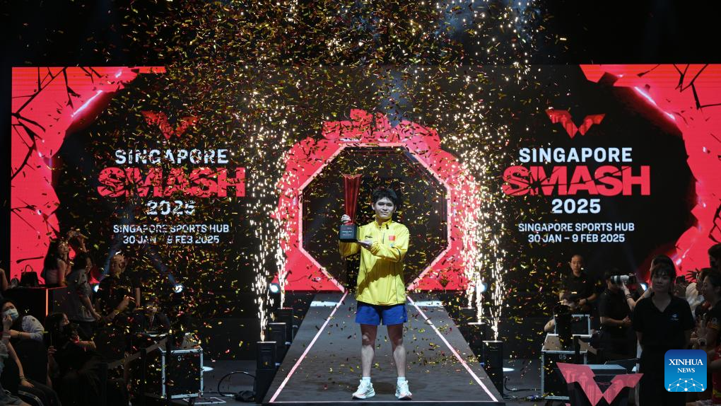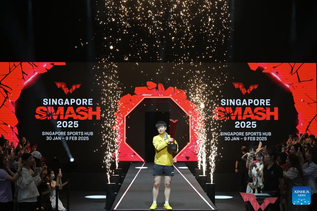 Sun Yingsha celebrates during the awarding ceremony after the women's singles final between Sun Yingsha of China and Kuai Man of China at the World Table Tennis (WTT) Singapore Smash 2025 in Singapore, Feb. 9, 2025. (Photo by Then Chih Wey/Xinhua)