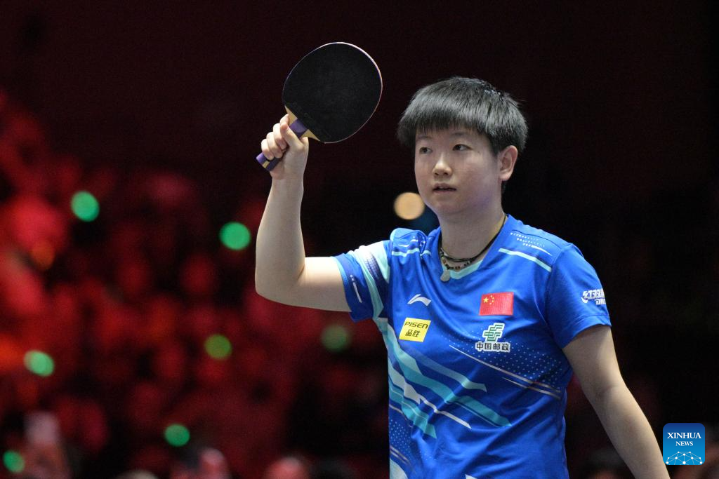 Sun Yingsha celebrates winning the women's singles final between Sun Yingsha of China and Kuai Man of China at the World Table Tennis (WTT) Singapore Smash 2025 in Singapore, Feb. 9, 2025. (Photo by Then Chih Wey/Xinhua)