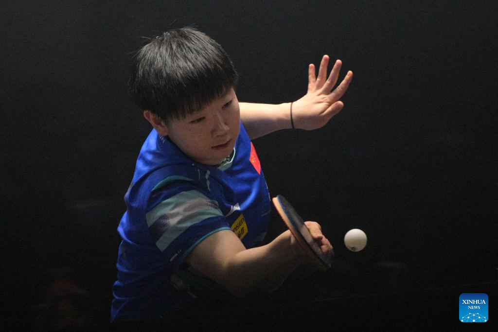 Kuai Man hits a return during the women's singles final between Sun Yingsha of China and Kuai Man of China at the World Table Tennis (WTT) Singapore Smash 2025 in Singapore, Feb. 9, 2025. (Photo by Then Chih Wey/Xinhua)