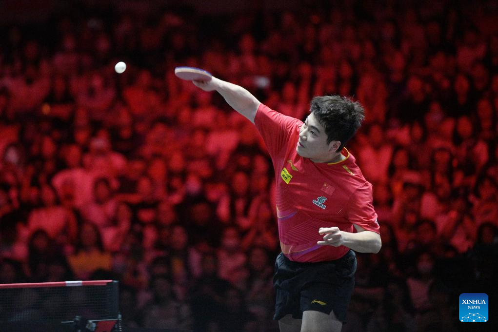 Liang Jingkun hits a return during the men's singles final between Lin Shidong of China and Liang Jingkun of China at the World Table Tennis (WTT) Singapore Smash 2025 in Singapore, Feb. 9, 2025. (Photo by Then Chih Wey/Xinhua)