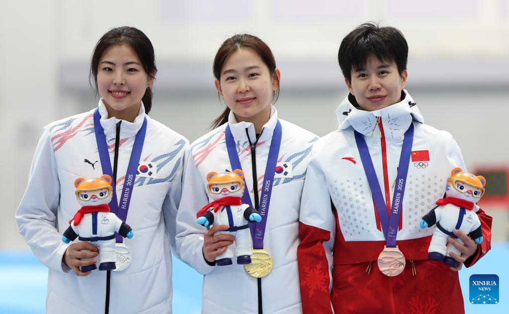 Gold medalist Kim Minsun (C) of South Korea, silver medalist Lee Nahyun (L) of South Korea and bronze medalist Tian Ruining of China pose during the awarding ceremony after the speed skating women's 500m final at the 9th Asian Winter Games in Harbin, northeast China's Heilongjiang Province, Feb. 9, 2025. (Xinhua/Wang Kaiyan)