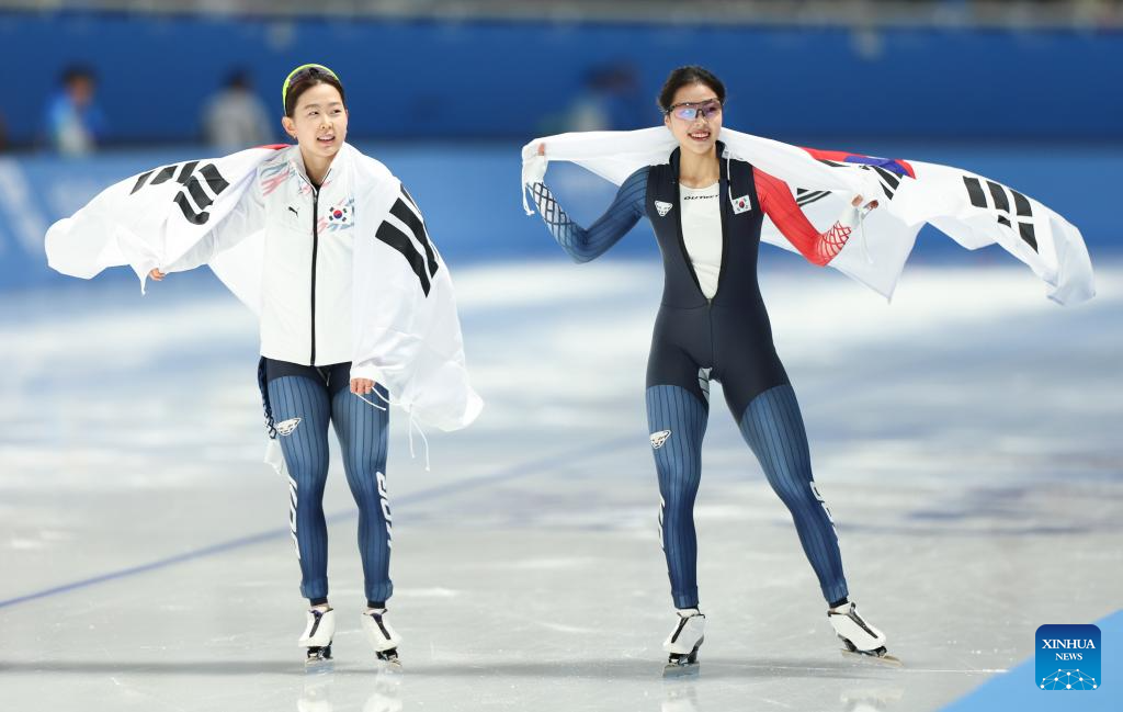 Kim Minsun (L) and Lee Nahyun of South Korea react after the speed skating women's 500m final at the 9th Asian Winter Games in Harbin, northeast China's Heilongjiang Province, Feb. 9, 2025. (Xinhua/Wang Kaiyan)