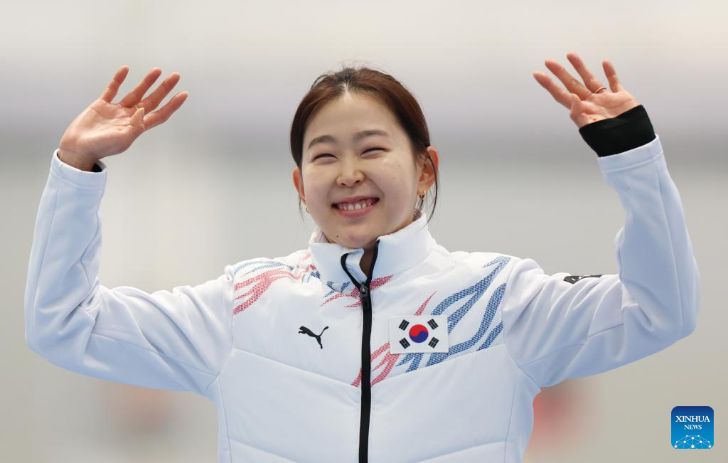 Kim Minsun of South Korea waves during the awarding ceremony after the speed skating women's 500m final at the 9th Asian Winter Games in Harbin, northeast China's Heilongjiang Province, Feb. 9, 2025. (Xinhua/Wang Kaiyan)