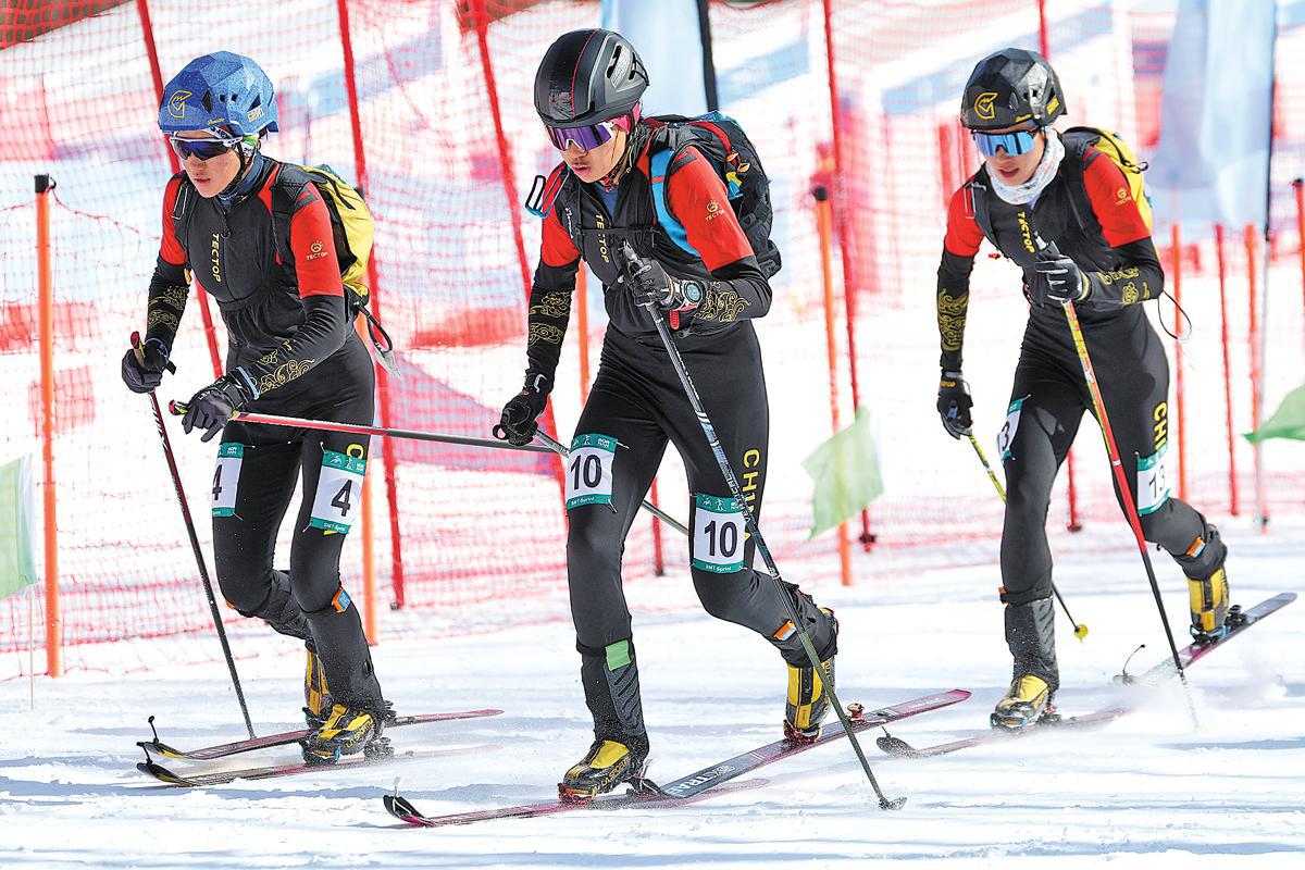 Chinese athletes (from left) Cidan Yuzhen, Suolang Quzhen, and Yu Jingxuan compete in the women's ski mountaineering sprint final on Sunday during the Asian Winter Games in Harbin, Heilongjiang province. They won all three medals in the event. (Wei Xiaohao/China Daily)